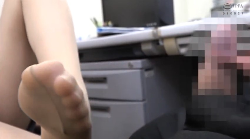 肝心の足裏シーンなのですが、前半のオフィスでこっそり上司の股間を蹴りまくるシーンで、パンスト越しの足裏を見ることができます。