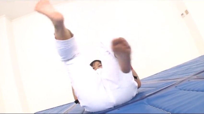 今回の作品の足裏シーンは、主に前半のストレッチ(柔軟体操)シーンで見ることができます。特に前屈の体勢のシーンの足裏がオススメで、足元からのアングルで足裏をドアップで見られます。この前屈の体勢の足裏は、道着姿バージョンと全裸バージョンの2ヵ所ありますので、それぞれ要チェックです。