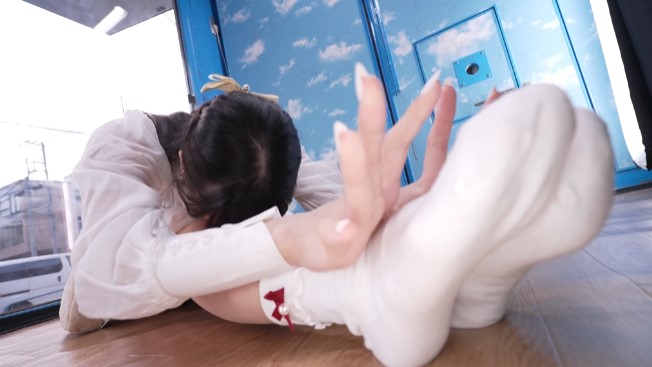 前屈、まんぐり返し、立ちかなえ、屈曲位などの足裏が登場。最後の屈曲位の足指グー足裏はかなり力強いので要チェック。最初の前屈だけは白の靴下足裏。
