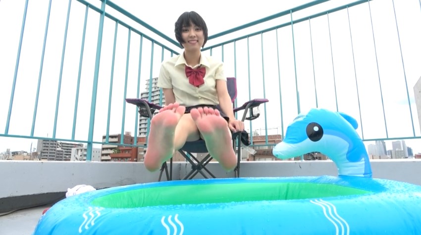 1人目はもなみ鈴。屋外のシーンからスタートし、ルーズソックスを脱いで素足の足裏を見せてくれます。さらに水の入ったビニールプールも用意されており、濡れた足裏のドアップを見せてくれたりするのもポイントです。