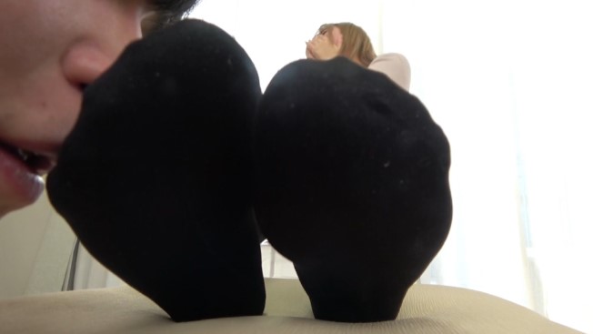 まず最初に足裏を見せてくれるのは2:08から。長座で両足の黒のニーハイ足裏を見せてくれます。結構しっとりムレムレな足裏で、ニーハイ越しながらなかなか良い香りがするようで、早速足嗅ぎされちゃいます。恥ずかしがる様子も可愛らしいです。