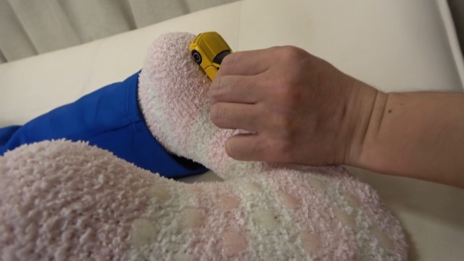 最初の1分くらいはうつ伏せの靴下足裏も登場したりするのですが、早々に退場し、1:06:58辺りから生足裏が登場。その後1:07:10からの体育座り(M字開脚気味)で両足の足裏全体が登場し、足指の間に人形を詰め込まれたり、指先に接着剤を付けられ人形を固定されたり、足裏に車のオモチャを走らされたりするシーンが続きます。引いたアングルの足裏全体はもちろんですが、ドアップ足裏も何度も登場するので、足裏の見応えは十分ありますね。5分くらいとかなり長く続くので、じっくり楽しめるのも魅力のシーンです。