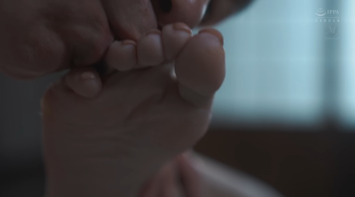 29:36 M字開脚で股間周辺を舐められているシーン。左足の足裏を1分くらいと長く見られるが、迫力はあまり無く、ピンボケしているところもある。さらに36:14から四つん這いアナル舐めの右足の足裏を40秒くらい、37:50からM字開脚クンニの左足の足裏を50秒くらい(ピンボケ)、41:22からM字開脚手マンの左足のピンボケしたドアップ足裏を15秒くらい見られる。54:55からは正常位の両足の足裏を20秒ほど、1:03:03辺りからバックの両足の足裏(左足メイン)を絶頂時も含めて40秒弱見られる。