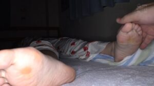 まず1人目の仲沢ももかは17:03から仰向けでドアップ足裏が登場。右足の足裏が6秒ほど→左足の足裏が10秒ちょっと→両足の足裏が6秒ほどと、トータル25秒くらいとまとまった時間ドアップ足裏を見られるのが特徴です。左足の足裏シーンでは足指をイジられる際に、少しだけ足指パーになるのがポイントですね。